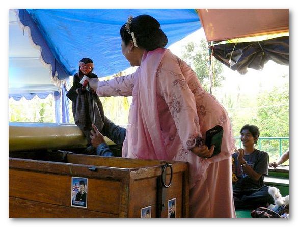 But soon after the first scene, the dalang stopped and introduced three famous Sundanese comedians who launched into an interactive dialogue with the audience. Spectators asked questions via SMS, which were relayed by the comedians to specialists from cultural and governmental institutions to be answered. After an hour of jokes and questions, the humourists retired from the stage and the wayang performance continued. The dalang recommenced his task of guiding the well-known characters through diverse intrigues and adventures. The rain had stopped, but there were still only a few spectators. Even fewer stayed until the performance ended at three o’clock in the morning.