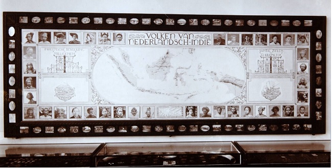 Racial categorisations of colonised peoples were visualised and disseminated on maps displayed in museums and exhibitions across the world. The map ‘Peoples of the Netherlands East Indies’ showed in its margins ‘forty photographs of typical heads of the different people of the Archipelago.’ It hung for two decades in the Colonial Museum in Amsterdam – now Tropenmuseum and part of Nationaal Museum voor Wereldculturen (National Museum for World Cultures). From the 1920s until 1948 this map outlined and visualised the racial classifications of Indigenous Indonesians and of geographical regions of Indonesia for the Dutch museum visitor.